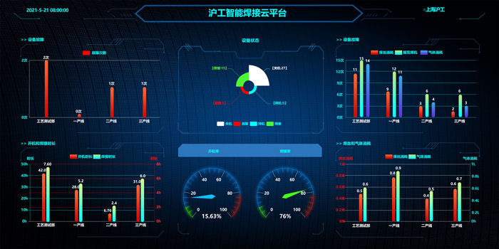 滬工焊接設備在各行業領域的應用,并被賦予更高的焊接目光,滬工智能焊接云平臺,可互聯多臺焊接設備,針對大型焊接車間設備數量眾多,對焊接設備進行產能的管理、焊接狀態的監控、生產統計等,助力工業焊接更智能化。