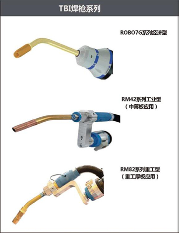 TBI焊槍系列包括ROBO7G系列經濟型、RM42系列工業型(中薄板應用)、RM82系列重工型(重工厚板應用)。